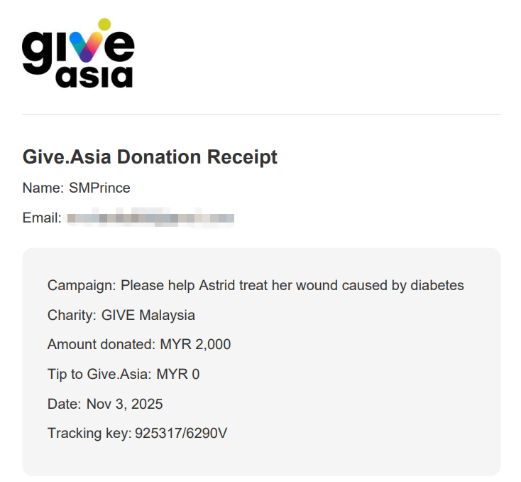 | 03/11/2025 | Please help Astrid treat her wound caused by diabetes | MYR 2,000.00 | more |
