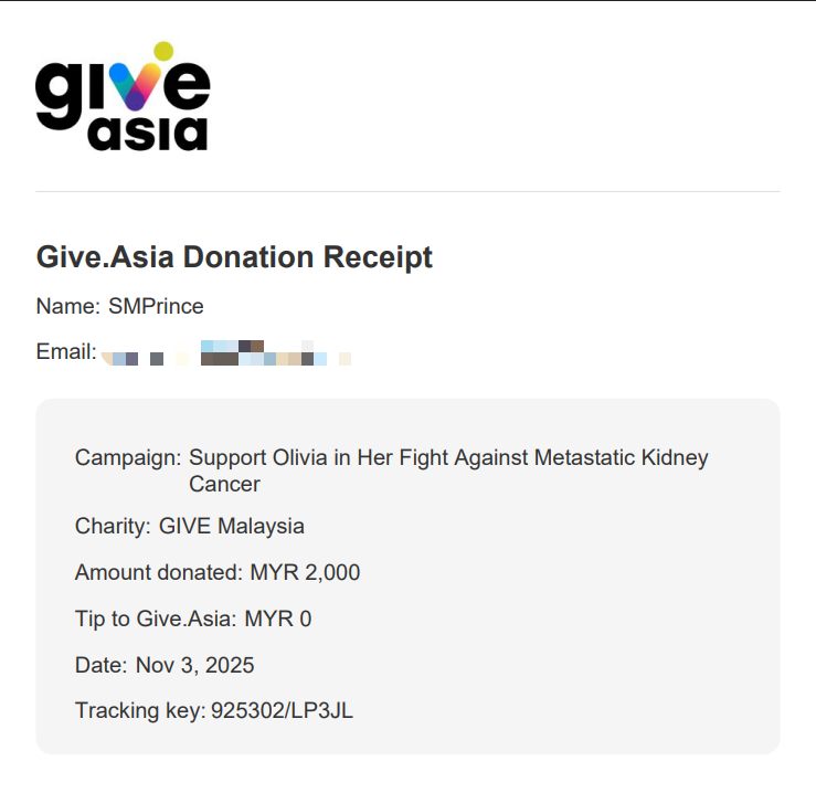 | 03/11/2025 | Support Olivia in Her Fight Against Metastatic Kidney Cancer | MYR 2,000.00 | more |